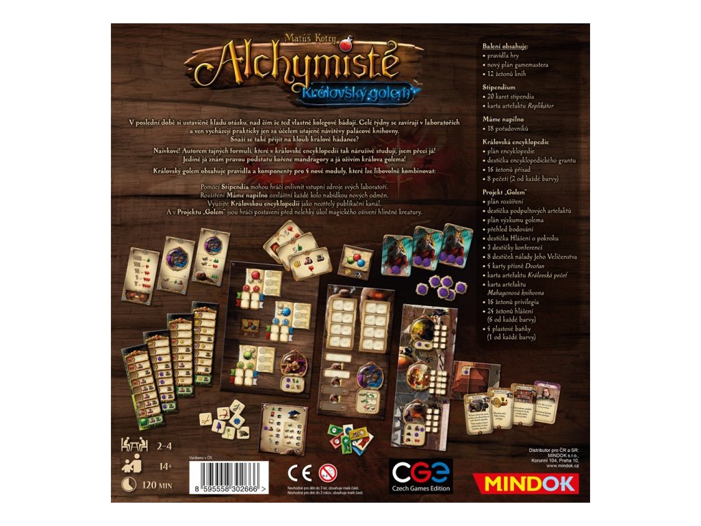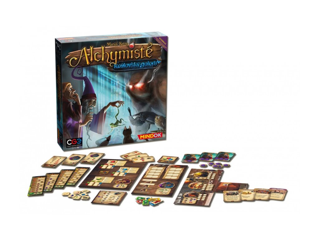 V poslední době si ustavičně kladu otázku, nad čím že teď vlastně kolegové bádají. Celé týdny se zavírají v laboratořích a ven vycházejí prakticky jen za účelem utajené návštěvy palácové knihovny. Snaží se také přijít na kloub králově hádance? Naivkové! Autorem tajných formulí, které v královské encyklopedii tak náruživě studují, jsem přeci já! Jedině já znám pravou podstatu kořene mandragory a já oživím králova golema! Královský golem obsahuje pravidla a komponenty pro 4 nové moduly, které lze libovolně kombinovat: Pomocí Stipendia mohou hráči ovlivnit vstupní zdroje svých laboratoří. Rozšíření Máme napilno ozvláštní každé kolo nabídkou nových odměn. Využijte Královskou encyklopedii jako neotřelý publikační kanál. A v Projektu „Golem“ jsou hráči postaveni před nelehký úkol magického oživení hliněné kreatury.