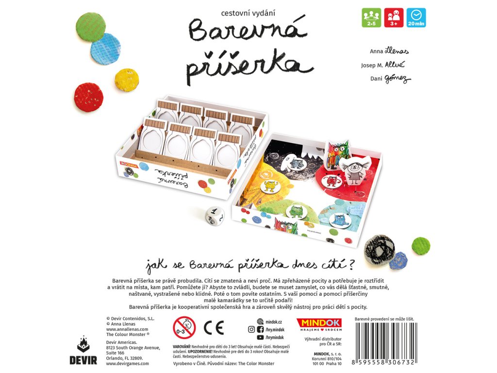 Barevná příšerka je kouzelná kooperativní hra pro děti i rodiče, založená na oblíbené knize Anny Llenas. Barevná příšerka se probudila zmatená a má zpřeházené pocity. Vaším úkolem je, společně s její malou kamarádkou, pomoci jí je roztřídit – štěstí, smutek, vztek, strach a klid – a uložit je do správných sklenic, kam patří.
