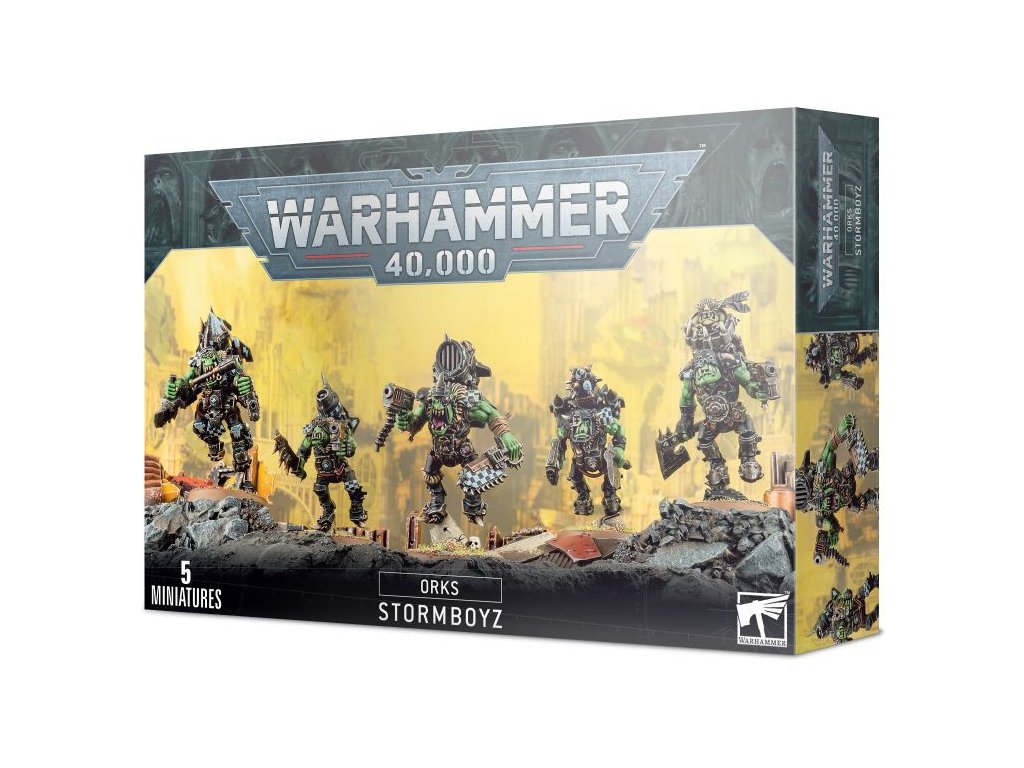 Sada obsahuje 5 plastových modelů Ork Stormboyz. Modely a jednotlivé části prodávané jako součást tohoto balení nejsou nabarvené ani zkompletované.