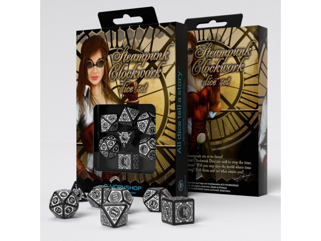 Každá kostka je detailně zdobená kovovými prvky, ozubenými koly a industriálními motivy pro maximální atmosféru při hraní.