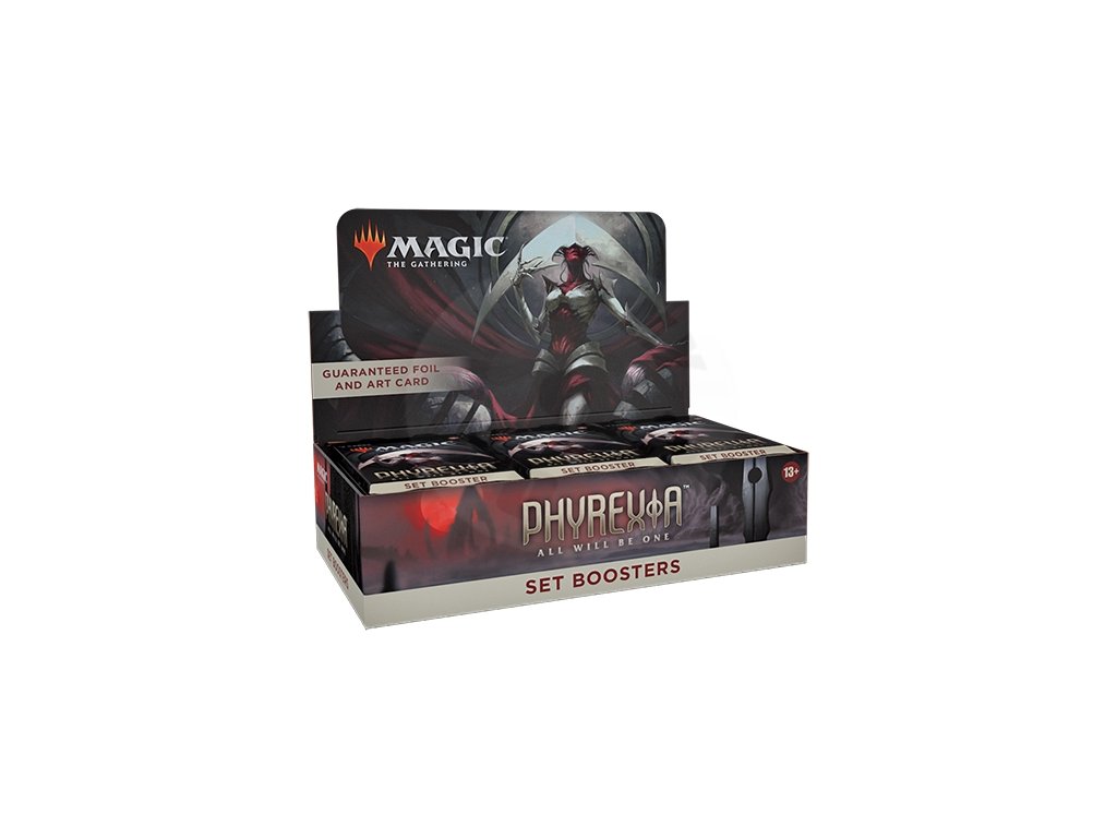 Originálně zabalený Set Booster Box z edice Phyrexia - All Will Be One obsahuje 30 dvanáctikaretních set boosterů.
