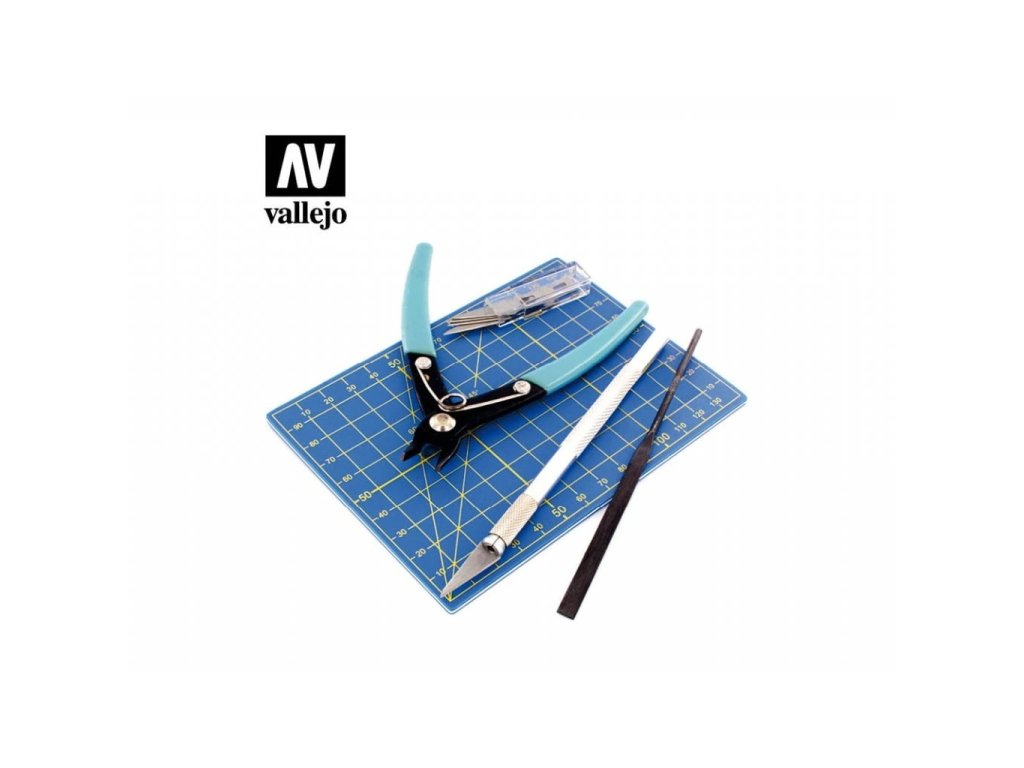 Sada modelářského nářadí značky Vallejo, určeného pro práci s plastovými figurkami.